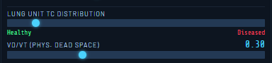 Range: Healthy (left) to Diseased (right). Controls the standard deviation of the alveolar time-constant distribution. In health, all lung units have similar time constants (narrow distribution) and empty nearly simultaneously, giving a flat Phase III plateau. As the slider moves toward Diseased, the distribution widens, causing slow units to empty progressively later in expiration and producing the characteristic rising Phase III slope of obstructive lung disease. This simultaneously affects the arterial blood gas — the V/Q heterogeneity associated with TC mismatch raises PaCO₂ above ETCO₂.